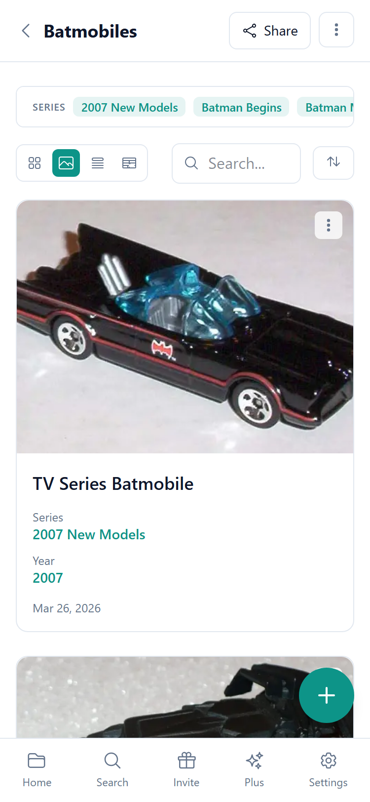 The default view. Shows your items as **cards with photos** in a grid. Great for collections where photos are important, like dolls, sneakers, or vinyl records.